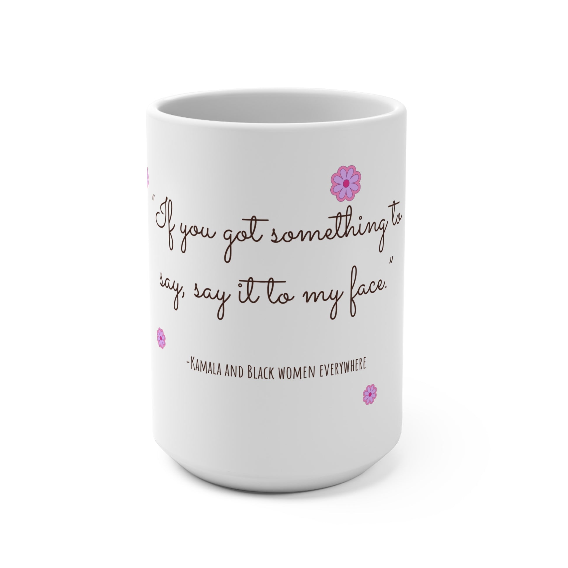 Start your day with a powerful statement! This elegant and empowering mug features the bold declaration, "If you got something to say, say it to my face," attributed to Kamala and Black Women Everywhere. Decorated with delicate, colorful flowers, this mug is not just a functional item but a daily reminder of strength and resilience.