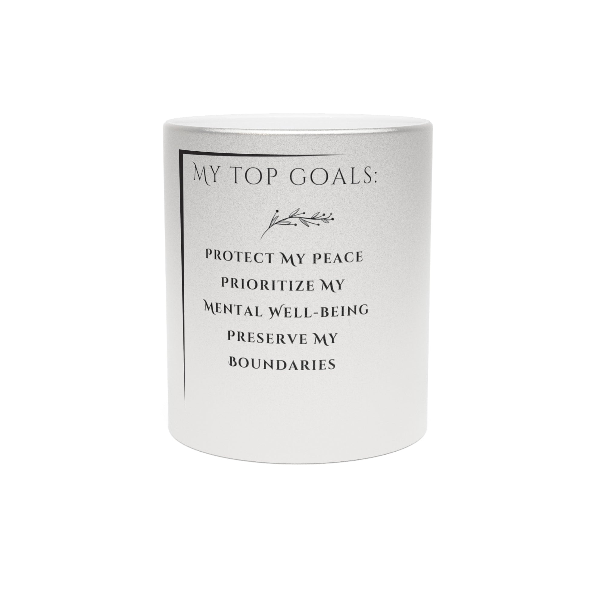 Elevate your daily routine with our beautifully designed "My Top Goals" inspirational mug. Perfect for your morning coffee or evening tea, this mug serves as a gentle reminder to prioritize your mental well-being and protect your peace.